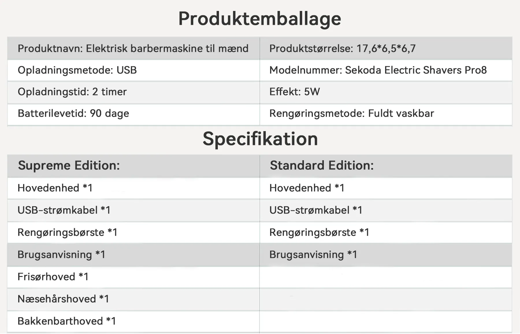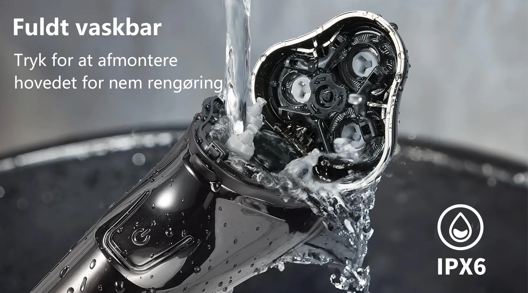 - IP6X vandtæt - Fuldt vaskbar ; ideel til våd- eller tørbarbering.